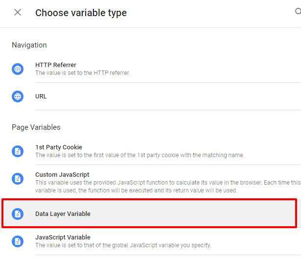 Click on the variable configuration panel, and from the list of available variable types, select “Data Layer Variable”. This tells GTM that the variable will pull information directly from the Data Layer.
